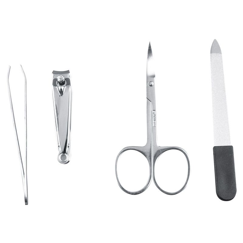 Kvalitní čtyřdílná manikúra v koženém pouzdře doplněném kovovým štítkem.